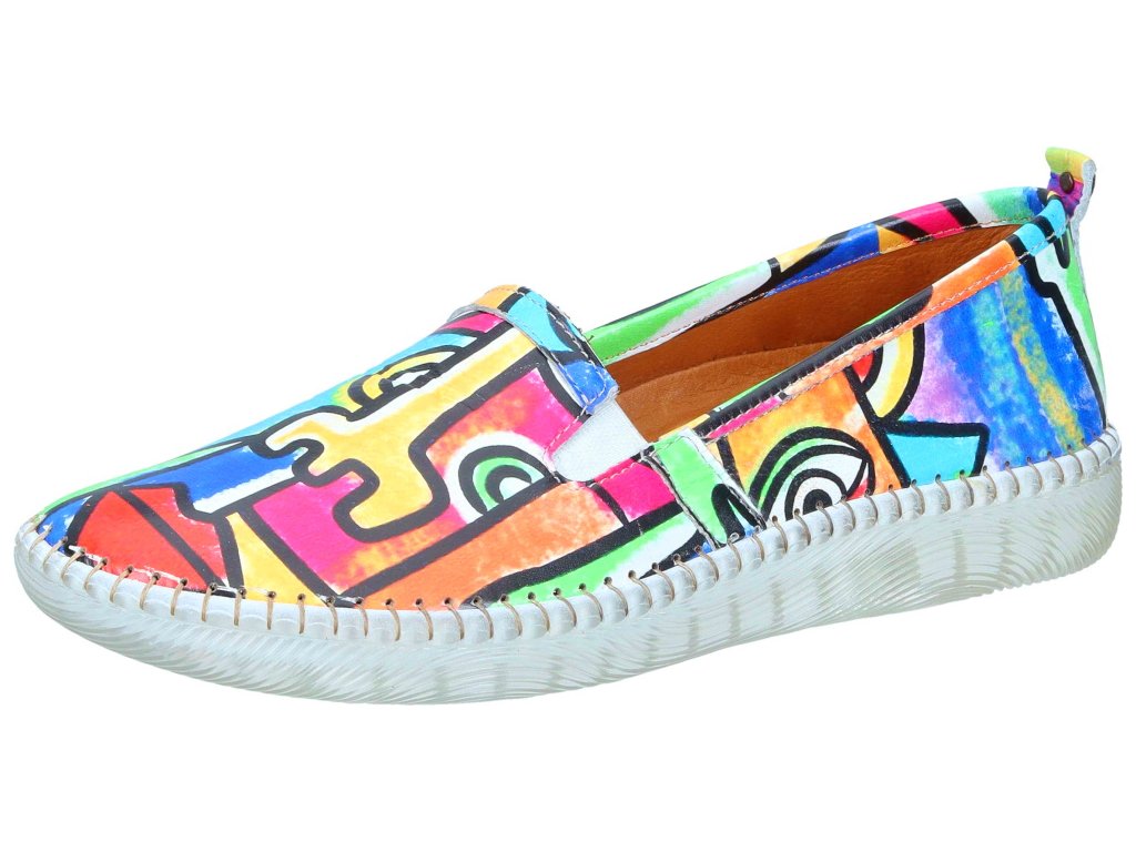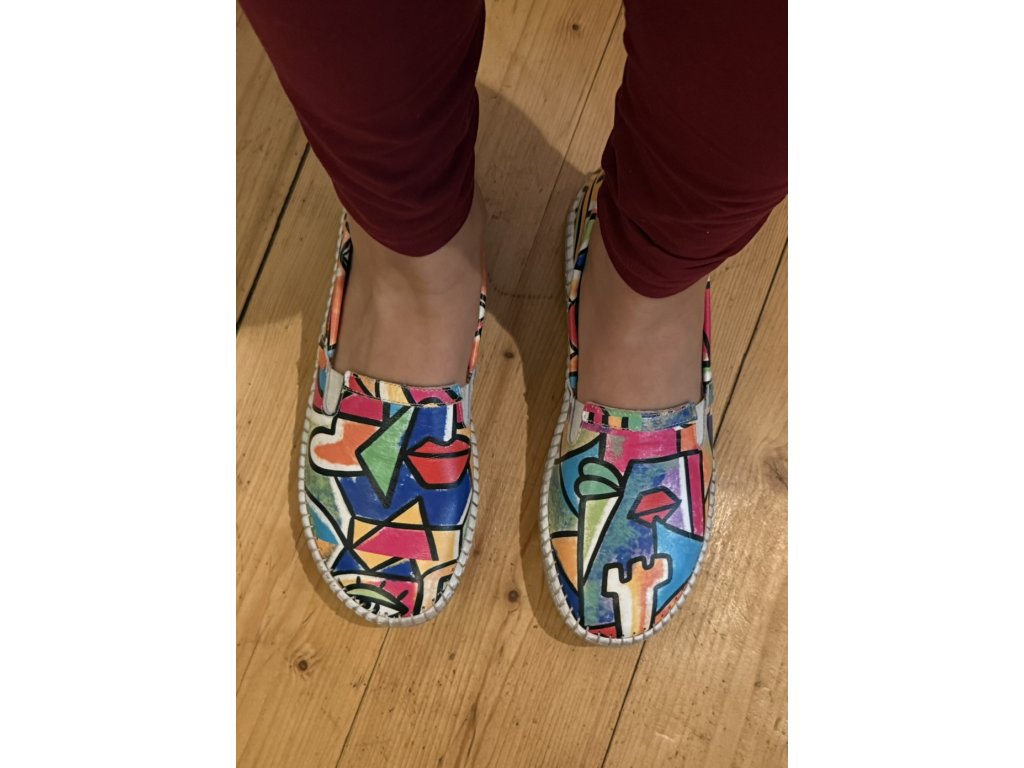 Kožené baleríny v kubistickém designu jsou měkké a pohodlné. Stélka v botách je vyjímatelná a kožená. Podešev je lehká a flexibilní s protiskluzovou úpravou. Díky praktickému poutku na patě a dvěma gumovým vsadkám si boty snadno nazujete a můžete pohodlně chodit.