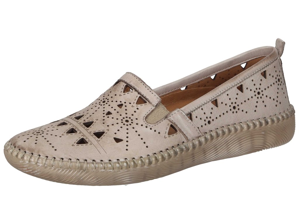 Kožené béžové baleríny jsou měkké a pohodlné s perforací. Stélka v botách je masážní a kožená. Podešev flexibilní s protiskluzovou úpravou.
