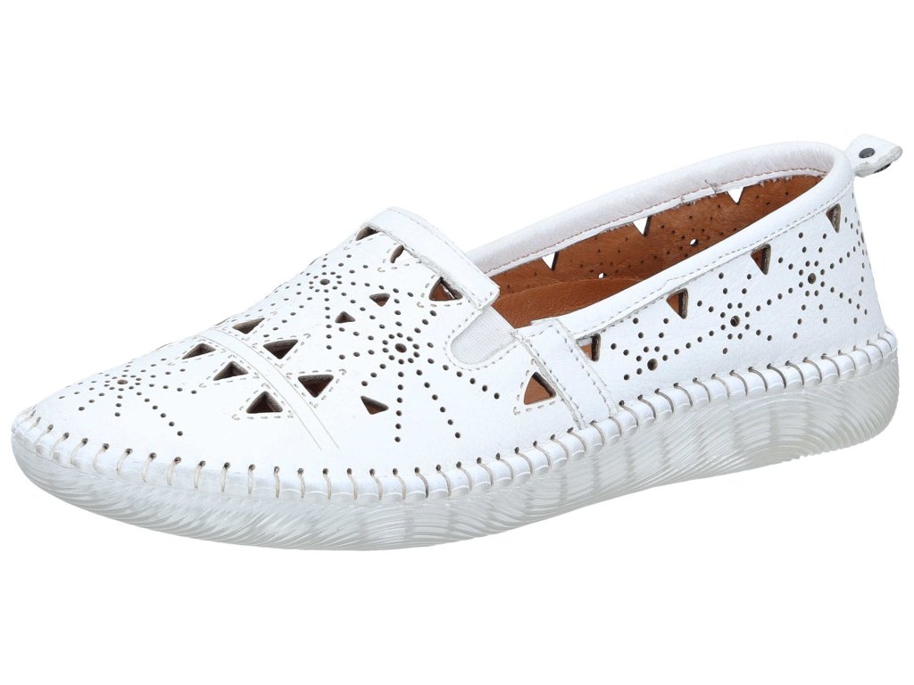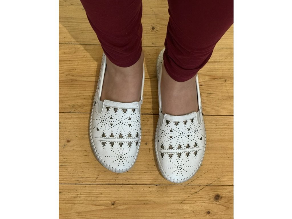 Kožené bílé baleríny jsou měkké a pohodlné s perforací. Stélka v botách je vyjímatelná a kožená. Podešev je lehká a flexibilní s protiskluzovou úpravou. Díky praktickému poutku na patě a dvěma gumovým vsadkám si boty snadno nazujete a můžete pohodlně chodit.