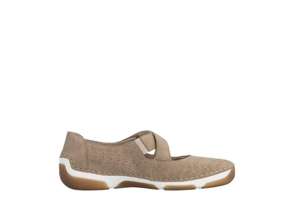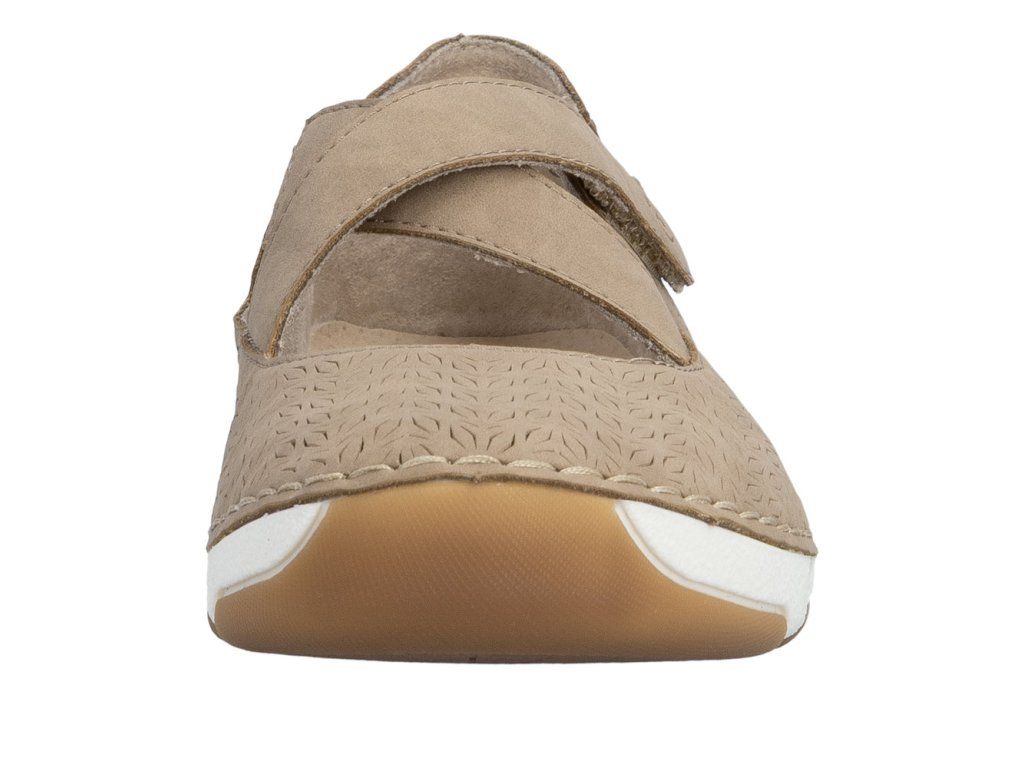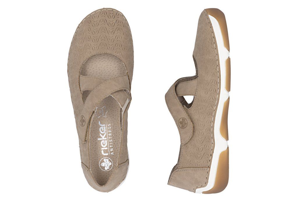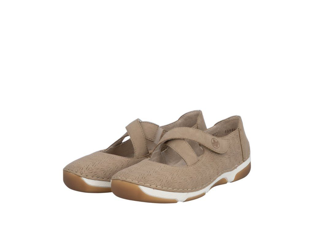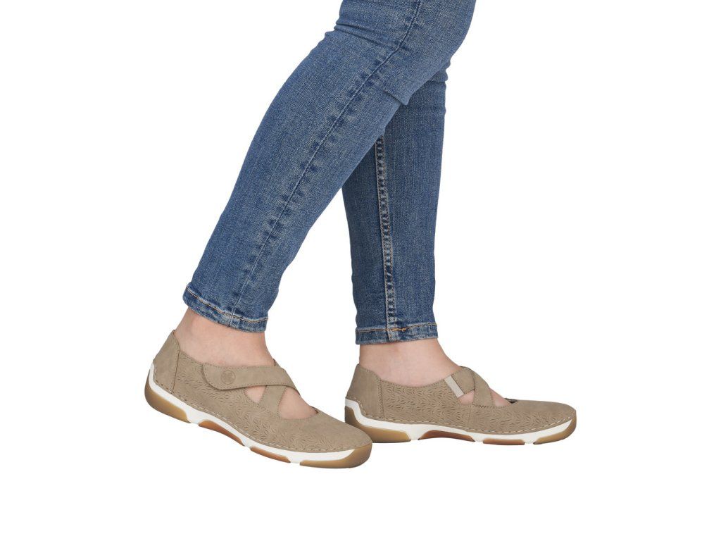 Béžový svršek s jemnou texturou vzoru přirozeně zvýrazní půvab těchto Rieker balerín. Dvojice pásků přes nárt krásně doplňuje design, ale také perfektně drží nohu – jeden s pružnou gumičkou se přizpůsobí každému kroku, druhý se suchým zipem zajistí rychlé obutí a ideální nastavení. Kožená stélka zajistí pocit pohodlí a flexibilní podešev tlumí nárazy.