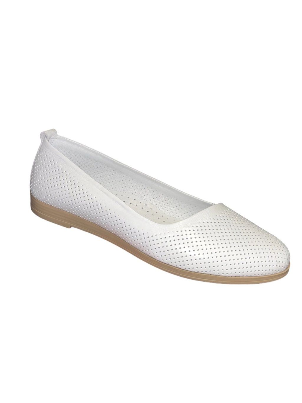 Elegantní dámské baleríny z kvalitní pravé kůže zaujmou svým čistým designem a jemnou perforací, která zajišťuje prodyšnost během celého dne. Měkká kožená stélka poskytuje maximální komfort při chůzi, zatímco flexibilní podešev se přizpůsobí pohybu chodidla. Univerzální bílá barva se snadno kombinuje s různými outfity, takže jsou ideální volbou pro každodenní nošení i lehce formální příležitosti.