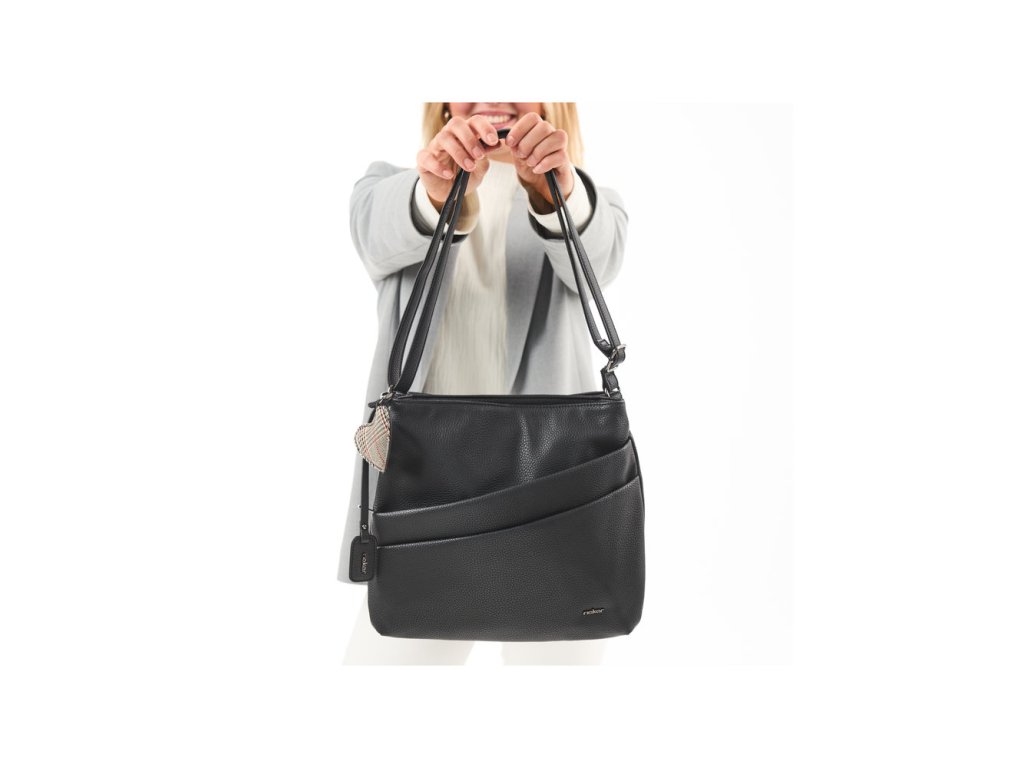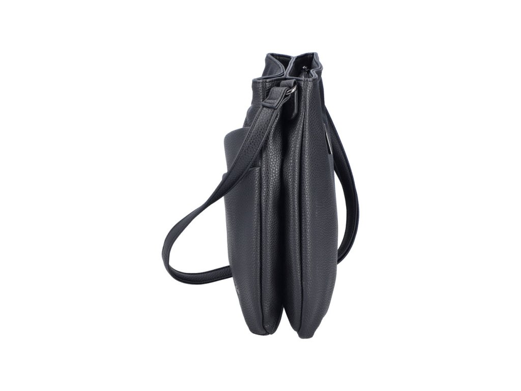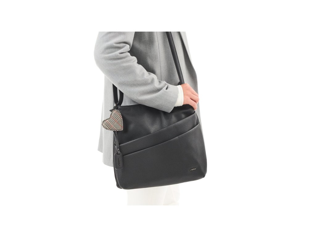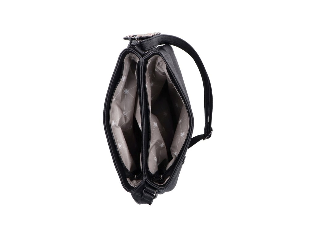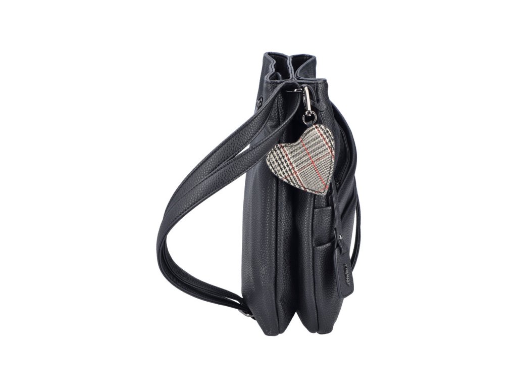 Kabelka má univerzální černý svršek s jemnou strukturou doplňují vkusné detaily, jako je přívěsek ve tvaru srdce. Kabelka má dvě samostatné přihrádky se zapínáním na zip a v jedné z nich se nachází další menší zipová kapsa. Přední strana kabelky je ozvláštněna efektním řasením s praktickými kapsami, další úložné místo naleznete také na zadní straně. Nastavitelný popruh vám poskytne pohodlí během nošení. Tento model je skvělou volbou pro každodenní nošení - stylový doplněk, který zároveň nabízí dostatek prostoru pro vše, co potřebujete.