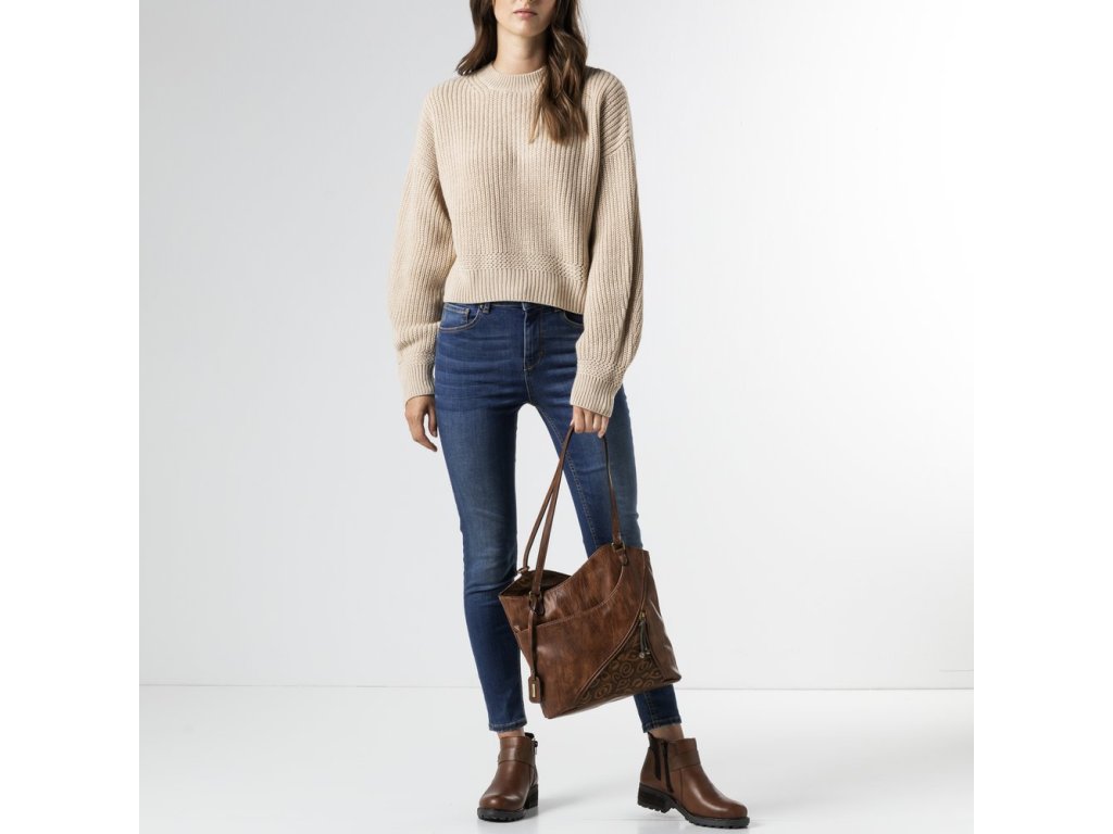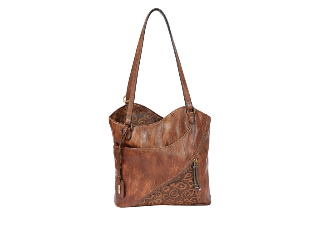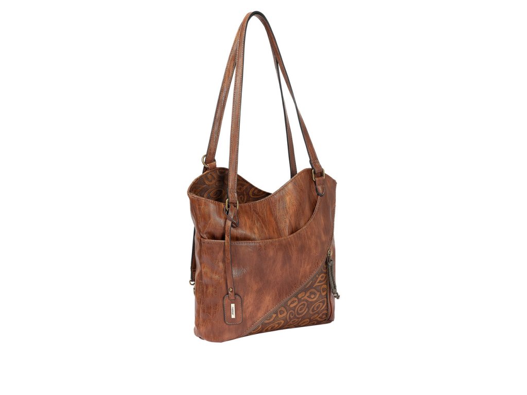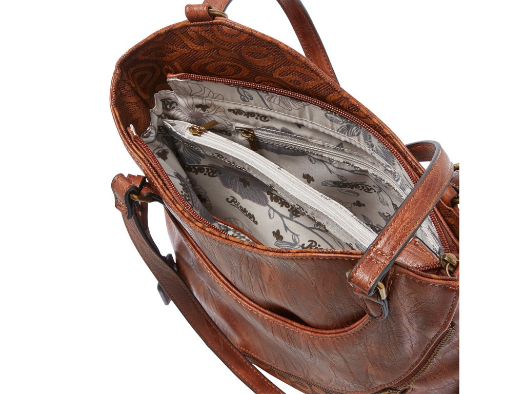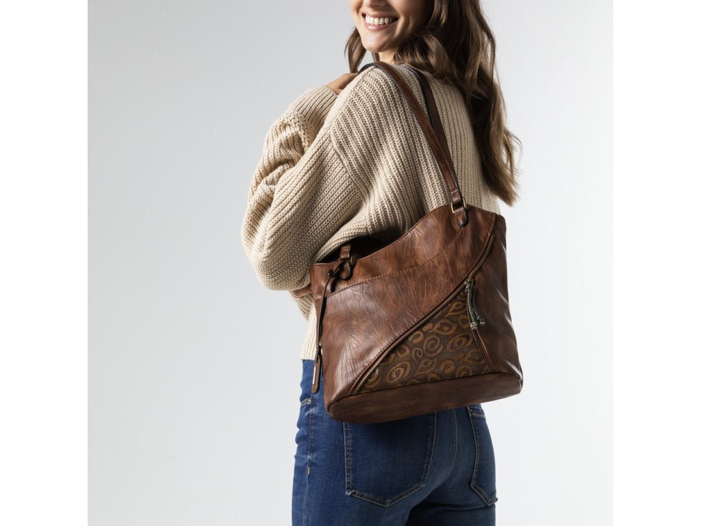 Svršek této kabelky Rieker je díky hnědému provedení a vzoru v dolním rohu poutavým a přesto decentním kouskem. Kabelka je zdobená přívěskem s logem značky a na zadní straně praktickou kapsou se zipem. U horního okraje se nachází zip, po jehož rozepnutí se otevře velká kapsa rozdělená praktickou kapsou na zip. Uvnitř kabelky se nacházejí také malé kapsičky vhodné k uložení drobností. Kabelka je vybavena dvěma delšími popruhy, díky čemu ji můžete pohodlně nosit přes rameno nebo zvolit variantu batohu.