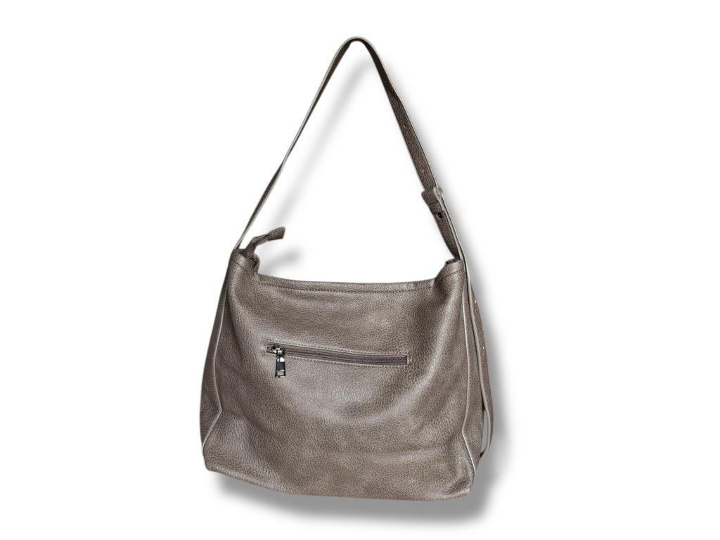 Dámská kabelka s nastavitelným popruhem je velmi měkká a příjemná do ruky. Vrchní část kabelky je uzavíratelná zipem. Uvnitř jsou dvě kapsy na zip a dvě boční kapsičky. Kabelka má elegantní šev na přední straně a na zadní straně malou kapsičku na zip.