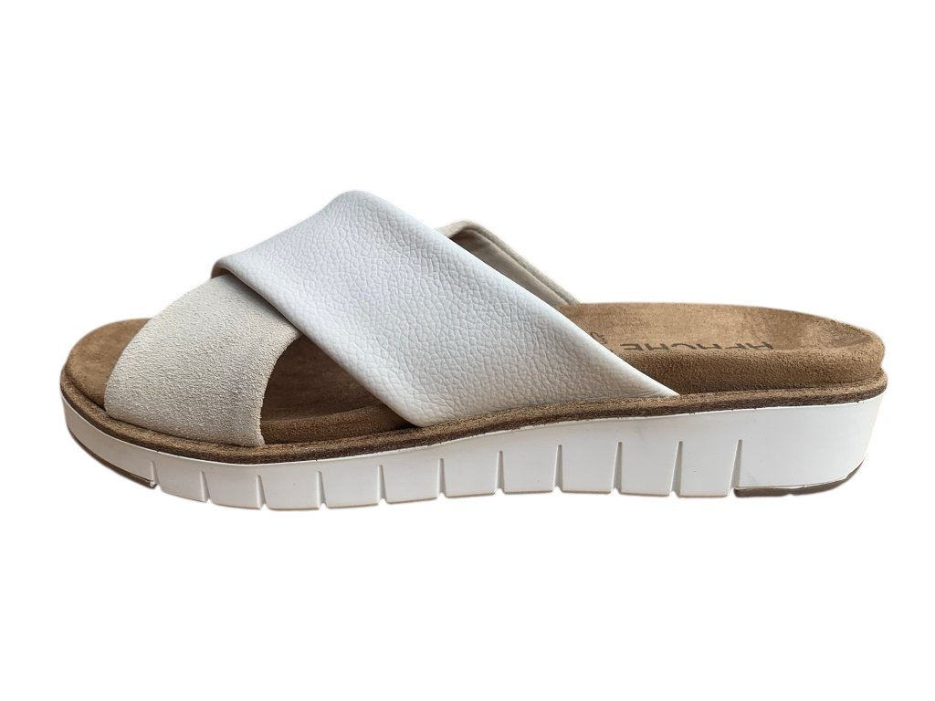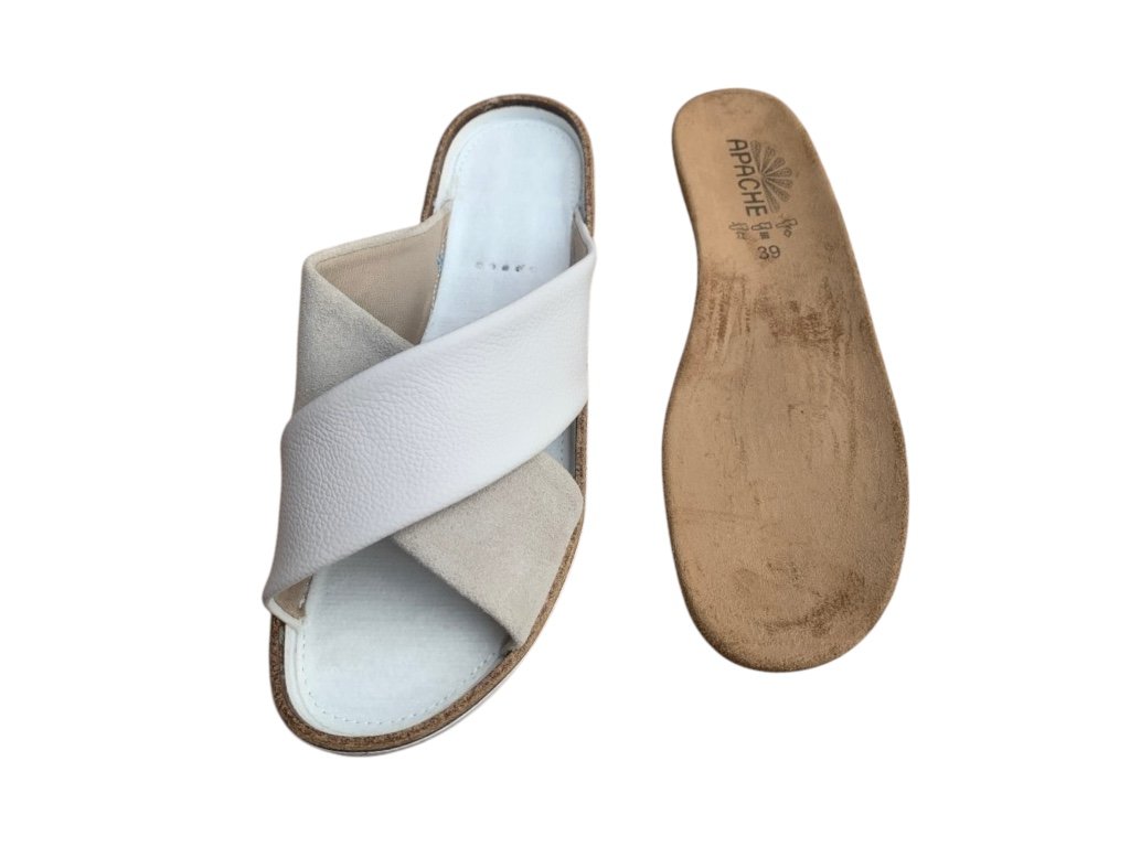 Dámské kvalitní, flexibilní a pohodlné nazouváky s vyjímatelnou stélkou. Boty jsou vyrobeny z měkké kůže překřížené na nártu. Bílý pásek je z hladké kůže a béžový pásek z broušené kůže. Oba pásky jsou podšité textilem. Podešev má protiskluzovou úpravu. Obuv je určena pro širší nohu G - H. Doporučujeme kupovat o číslo větší velikost.