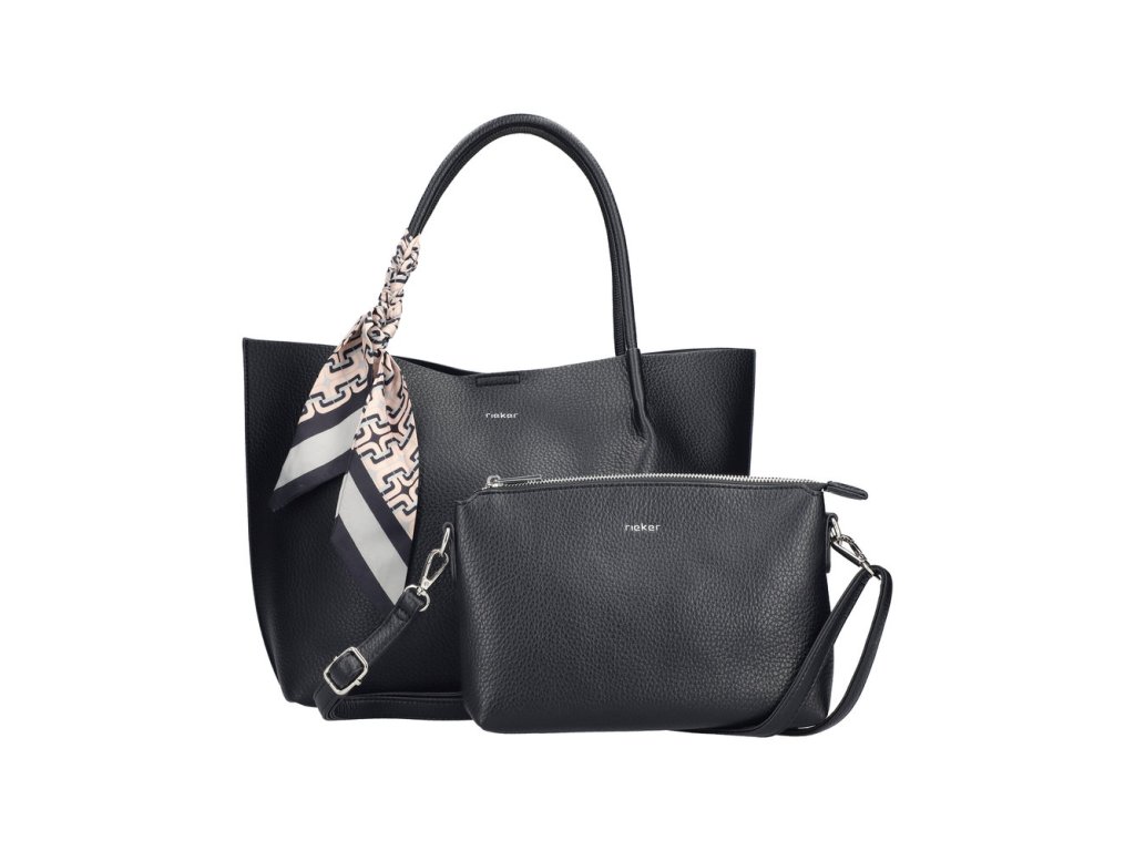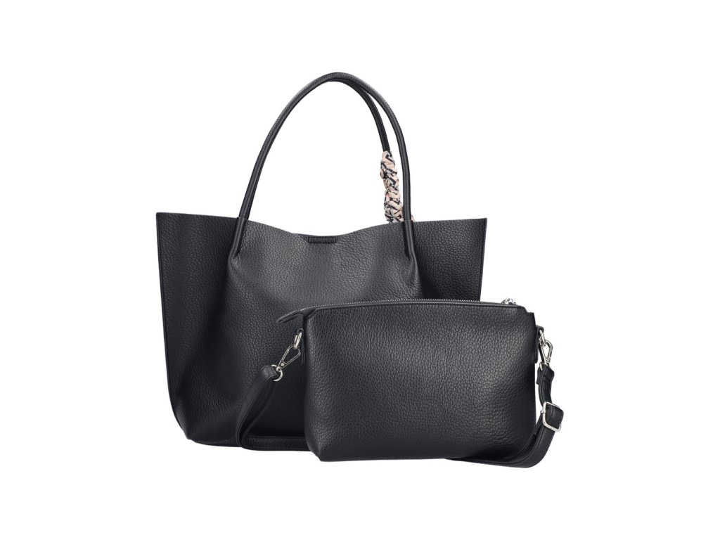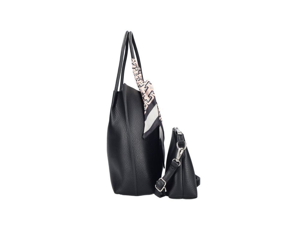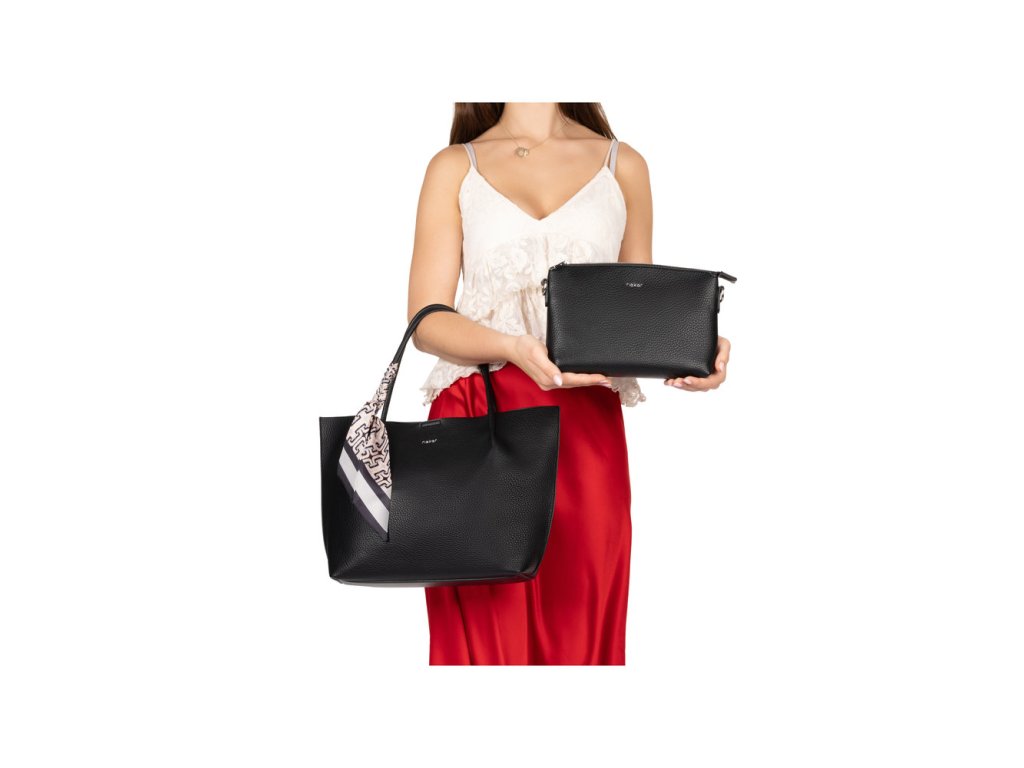 Tato černá kabelka zaujme svým minimalistickým designem a hladkým vnějším materiálem, doplněným stříbrnými detaily. Velurový šátek na rukojeti dodává kabelce půvab a osobitý vzhled. Malou kabelku s odepínatelným popruhem, který je délkově nastavitelný můžete nosit samostatně nebo ji vložit do větší kabelky a vytvořit tak praktické uspořádání prostoru. Dvě pevná ucha umožňují pohodlné nošení v ruce.