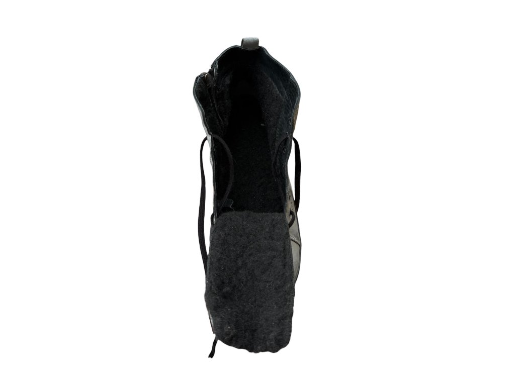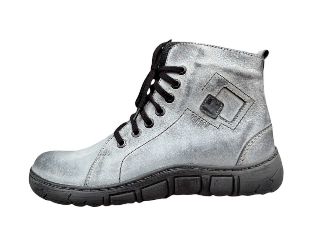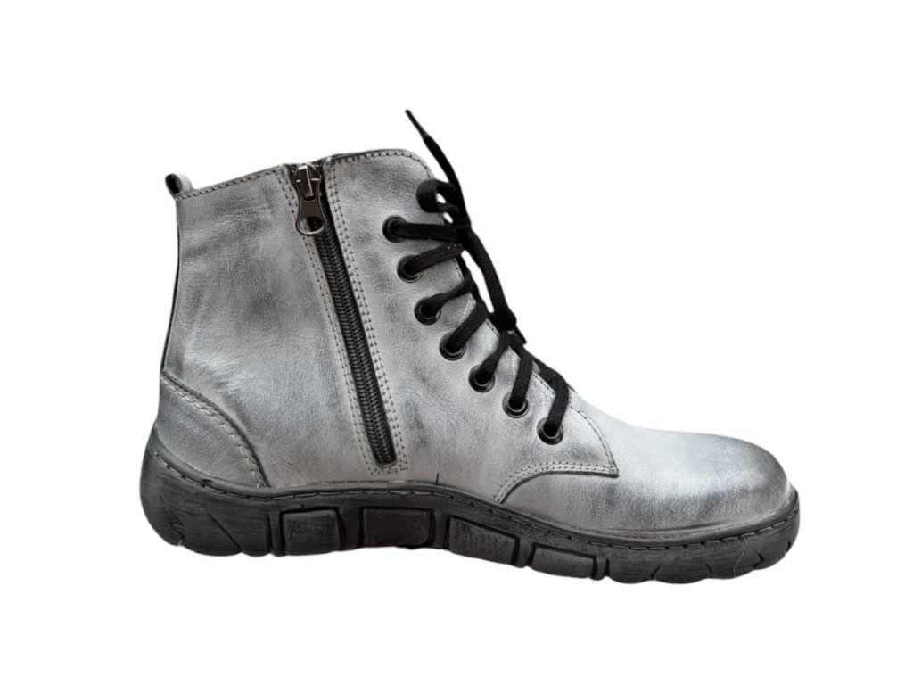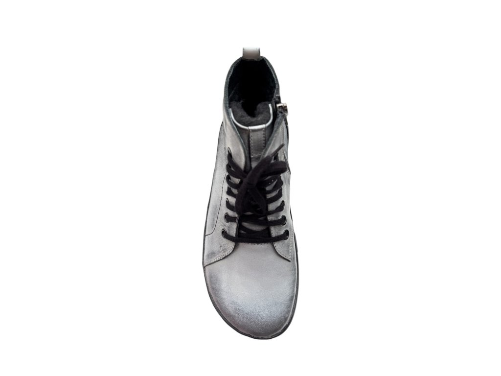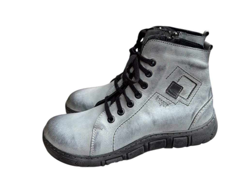 Dámské kožené kotníkové boty značky Kacper jsou v hladké kůži ve stírané šedé barvě se zipem na vnitřní straně a tkaničkami. Šněrování umožňuje přesné napasování na nohu. Vnitřek obuvi je vypodšívkován hustou vlněnou střiží (80% vlna, 20% syntetika). Výška kotníku činí cca 12cm (bez podešve). Výška podešve činí 2 cm a pod patou se zvedá na 3 cm. Obuv je vhodná pro širší chodidlo G-H.